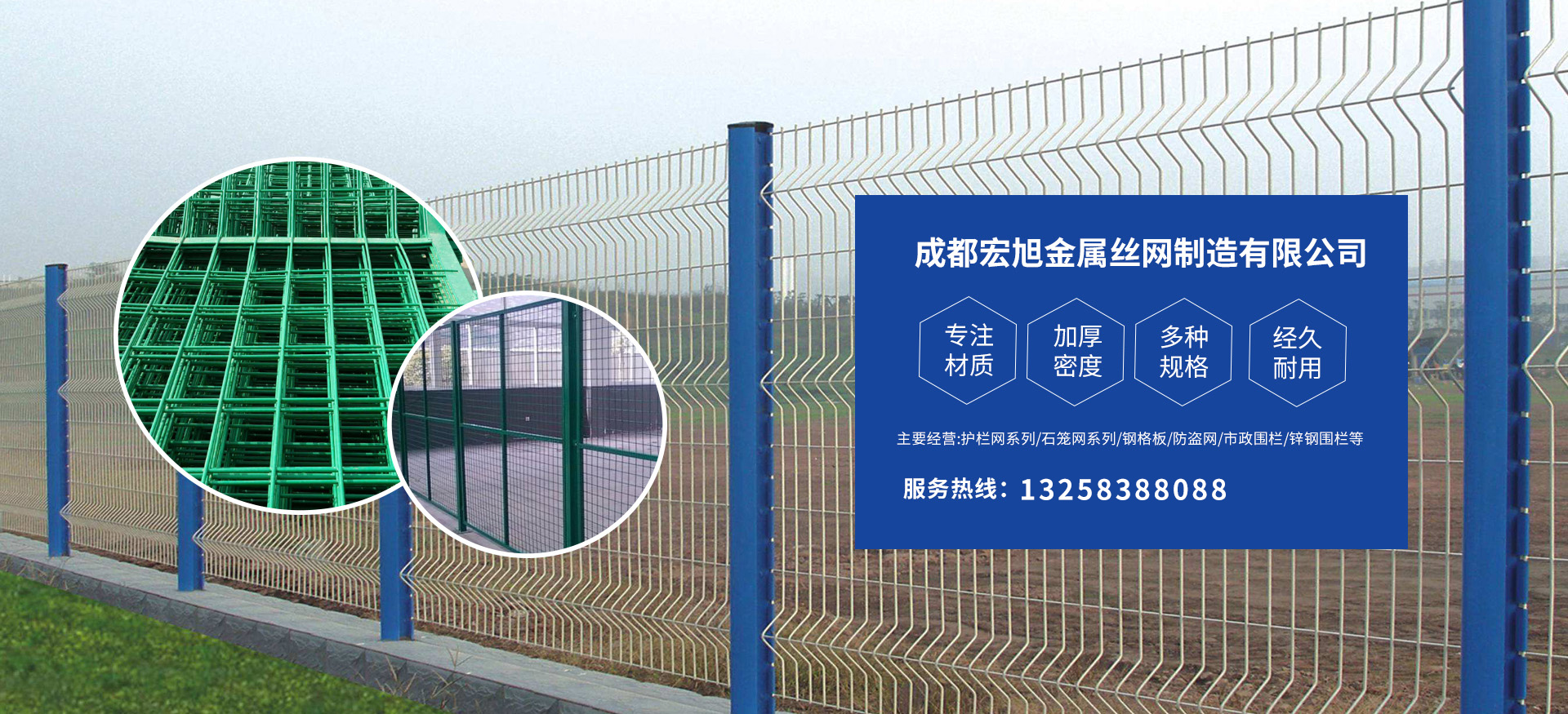 成都宏旭金屬絲網(wǎng)制造有限公司主營護(hù)欄網(wǎng)系列、石籠網(wǎng)系列、鋼格板、防盜網(wǎng)、市政圍欄、鋅鋼圍欄、鋼筋網(wǎng)片、聲屏障系列、波形護(hù)欄板、柔性纜索護(hù)欄、SNS邊坡防護(hù)網(wǎng)等其他絲網(wǎng)類產(chǎn)品。特殊規(guī)格可加工定做,也可根據(jù)客戶來圖來樣定做。自創(chuàng)業(yè)以來,公司一直堅(jiān)持市場為導(dǎo)向,以客戶為根本,以實(shí)業(yè)為基礎(chǔ),以技術(shù)為支持,以科研為后盾,集科研、生產(chǎn)、經(jīng)營為一體,不斷研制開發(fā)新產(chǎn)品,開拓市場,走綜合發(fā)展之路。多年來,公司憑借過硬的質(zhì)量,良好的信譽(yù)、優(yōu)質(zhì)的服務(wù)、合理的價(jià)格,贏得了市場和商家的一致好評。